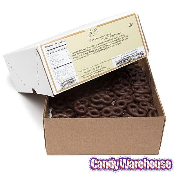 Box contains 4 pounds of Dark Chocolate Covered Mini Pretzels Candy.