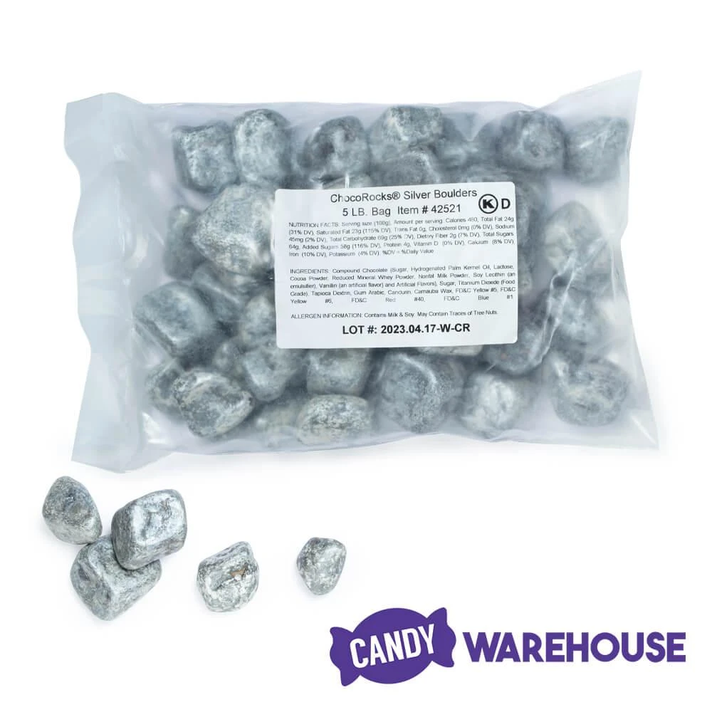 Bag contains 5 pounds of Choco Rocks Chocolate Silver Boulders Candy.