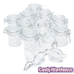 Adorable favor jars featuring metal swing top locking mechanisms and white rubber gaskets to seal in freshness. The have a nostalgic air about them, reminiscent of an old time apothecary candy counter or a pantry shelf of fruit preserves. Just waiting to be filled with your favorite sweets matching your party color scheme and decorated with your custom labels and ribbons, these unique jars make the perfect gifts at any special event!