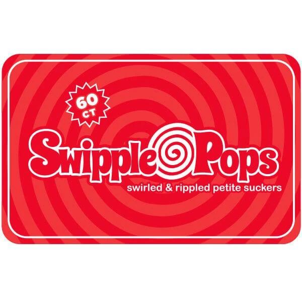 Resealable tub contains 60 individually wrapped Red Swipple Pops Petite Swirly Ripple Lollipops.